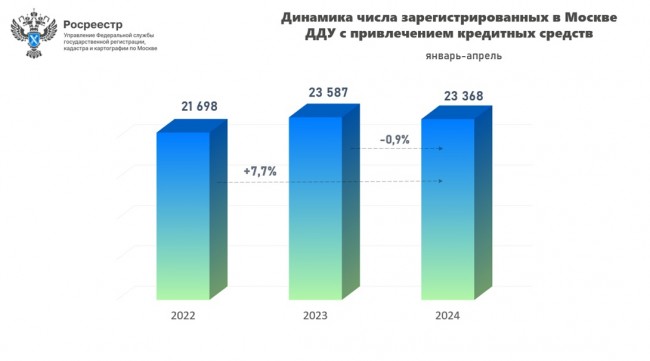 В апреле 2024 года Управлением Росреестра по Москве зарегистрировано 6 948 договоров долевого участия в строительстве жилой и нежилой недвижимости с привлечением кредитных средств, что на 1,3% больше, чем в предыдущем месяце (6 856 ДДУ). При этом доля сделок с ипотекой достигла 58% от всех договоров на первичном рынке и стала максимальным значением с начала года.