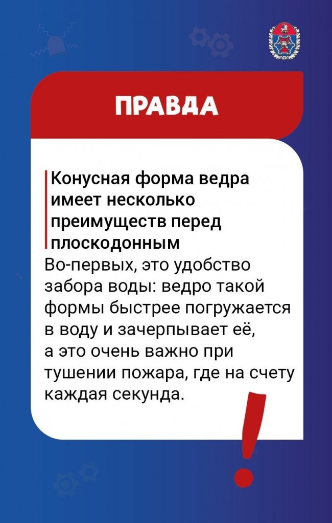 - Во-первых, это удобство забора воды: ведро такой формы быстрее погружается в воду и зачерпывает её, а это очень важно при тушении пожара, где на счету каждая секунда;